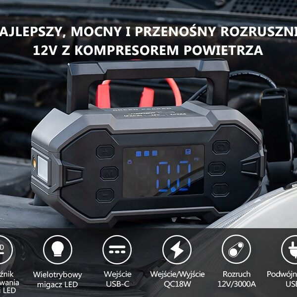 JUMP STARTER POWERBANK ROZRUCHOWY 3000A Z KOMPRESOREM 12V DO 8.0L BENZYNA I DIESEL
